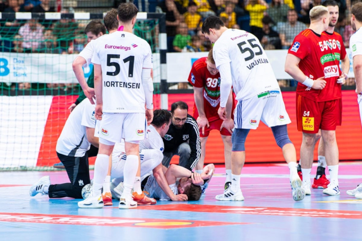Hamburg kämpfte mit den letzten Kräften und hatte kaum noch Wechselmöglichkeiten. Doch Dominik Axmann, der auf der ungewohnten halbrechten Position spielte, tankte sich durch und traf zum wichtigen 30:26 (51. Min.). Noch hatte der HSVH die Nase vor. Doch dann folgte der nächste Schock: Axmann ging ohne Gegnerkontakt zu Boden, schrie vor Schmerz auf und musste vom Feld begleitet werden. Er konnte mit Verdacht auf eine erneute schwere Knieverletzung nicht weiterspielen.