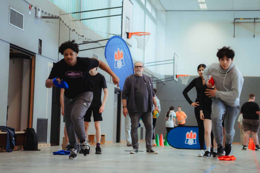 Das Schultraining wird von den HSVH-Nachwuchstrainern und Bundesliga-Spielern durchgeführt. Beim Besuch im Goethe-Gymnasium Hamburg waren neben Anschlussstrainer & Videoanalyst Lukas Ossenkopp auch die (ehemaligen) HSVH-Profis Leif Tissier und Robin Haug mit dabei. Gemeinsam zeigten sie den Schülerinnen und Schülern verschiedene Übungen rund um das Thema Ballgefühl, Technik und Koordination. Den Schülerinnen und Schülern wurde mit viel Spaß und Fachwissen der Handballsport nähergebracht – und dabei wurden sogar einige versteckte Talente entdeckt.
